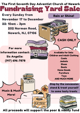 - POOR & THE NEEDY FUNDRAISING YARD SALES @ 202 NORMAN ROAD, NWK: TIME: 10AM-3PM DATES: DEC: 1,8,15, &22. CASH ONLY-DONATIONS OF HOME GOODS, SMALL PIECES OF FURNITURE, WINTER CLOTHING, BOOTS (MEN, WOMEN AND CHILDREN) ARE STILL NEEDED AND BEING ACCEPTED. THE LORD WILL BLESS YOU GREATLY.